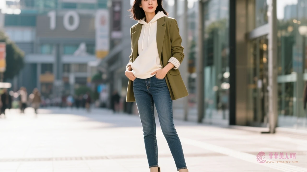 輕熟女想穿出年輕感不需硬裝可愛,選擇象牙白、燕麥灰等中性色帽T 搭配西裝外套瞬間平衡休閒與正式感!像這位麻豆用白色連帽上衣外罩卡其西裝 下身搭配合身九分褲與尖頭靴,率性又不失女人味~