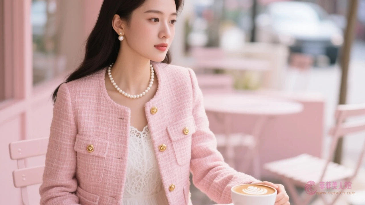 櫻花粉小香風外套絕對是今年必收單品!內搭白色蕾絲裙甜美又貴氣,適合約會或姐妹午茶趴。挑選時注意外套版型要合身,避免OVERSIZE設計反而顯胖。