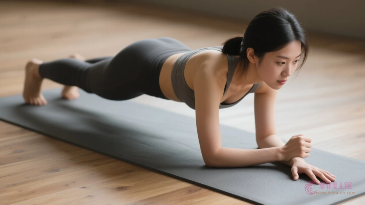 - 從側面看頸背臀腿成直線,收緊核心肌群