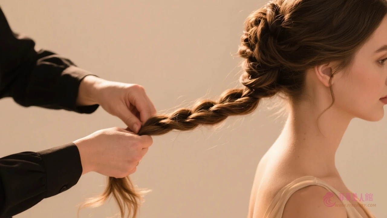 STEP 2: 將左側預留髮束向內旋轉後與頭頂髮髻銜接,右側同步重複相同手法,呈現優雅線條感。
