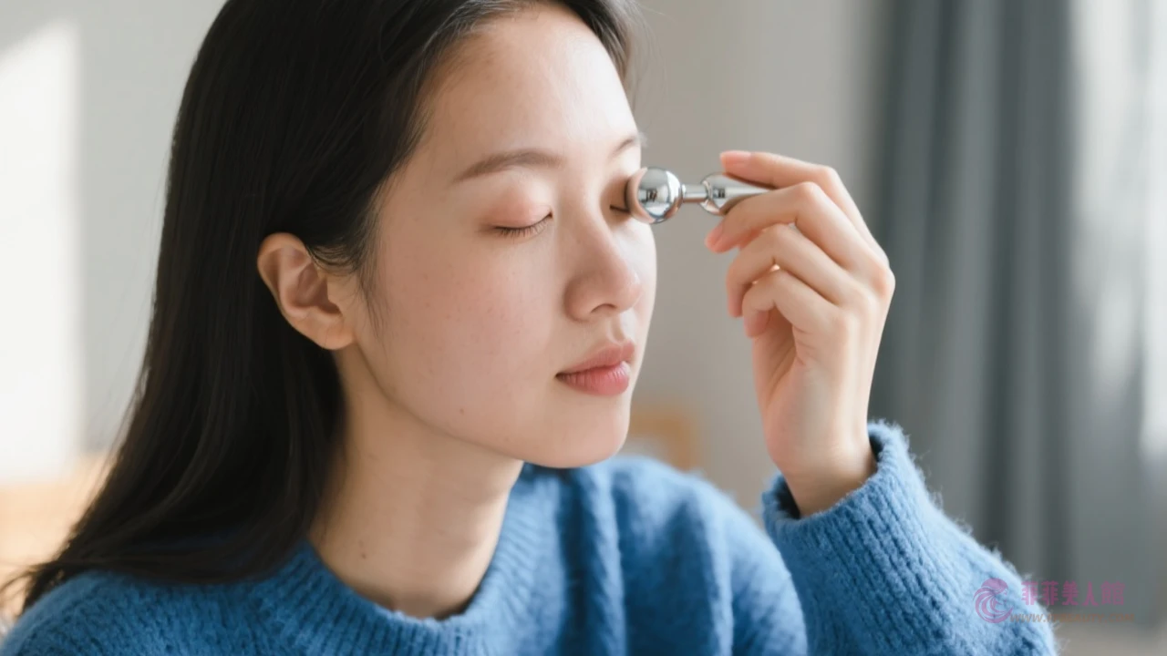 第一步:輕點取代拉扯 用滾珠棒在眼下肌膚「輕點」上霜,這個動作比用手指塗抹更溫柔,完全避開拉扯細緻眼周的可能。{
