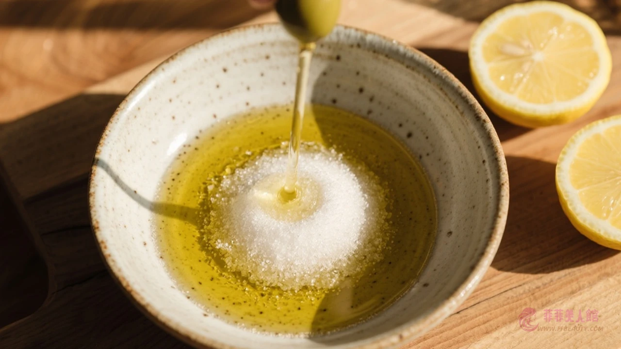 將1茶匙特級初榨橄欖油與半茶匙白砂糖混合,用指腹以畫圓方式溫柔按摩雙唇。砂糖顆粒會帶走皮屑,橄欖油同時滋潤,洗完會有嬰兒般的柔嫩觸感~