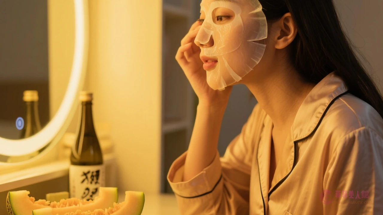 去皮冬瓜切薄片,加等量礦泉水和米酒小火熬煮成凝凍狀,冷卻後就是超好用的晚安凍膜!睡前薄擦全臉,隔天起床用清水洗淨即可。冬瓜的維C搭配米酒酵素,特別能改善蠟黃膚況。 [台灣女生在化妝台前塗抹透明凝凍,桌上有切半冬瓜與清酒瓶,暖黃燈光居家照]