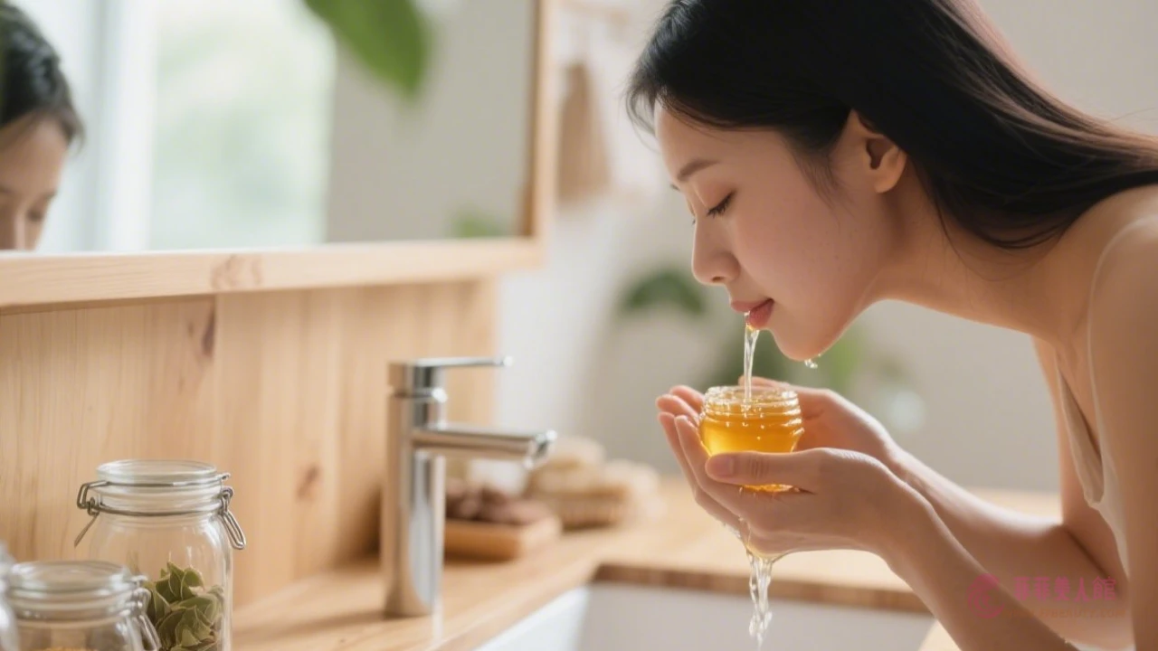 將新鮮天門冬搗碎後與純蜂蜜調和,直接加入日常洗臉水中使用。這款天然的美白洗顏配方能溫和代謝老廢角質,每天洗臉時順便保養,不知不覺就能養出白裡透紅的好氣色喔! [亞洲女性在木質調洗手台用雙手捧水洗臉,蜂蜜罐與植物擺在檯面上,淺焦攝影風格]